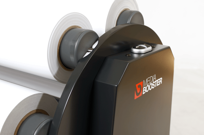Gewinnen Sie viel Zeit beim schnellen Medienwechsel und sparen Sie zusätzlich wertvolles Druckmaterial. Durch den Media Booster sind die Druckmaterialien vor Staub und Fingerabdrücken viel besser geschützt. Fehlerhafte Ausdrucke durch geknickte Materialkanten und falsches Lagern der Rollen werden mit dem Media Booster zusätzlich vermieden.